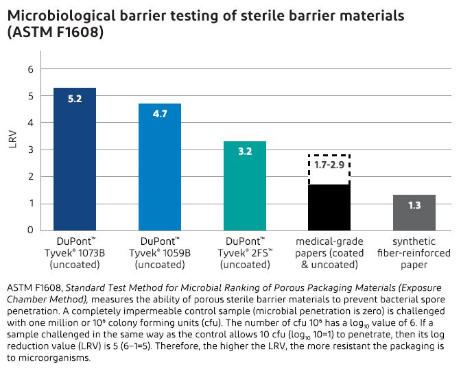 Tyvek® 1073B, tel qu'indiqué dans le graphique ci-dessous, présente une VRL de 5,2 et représente le meilleur substrat poreux disponible sur le secteur des emballages médicaux.