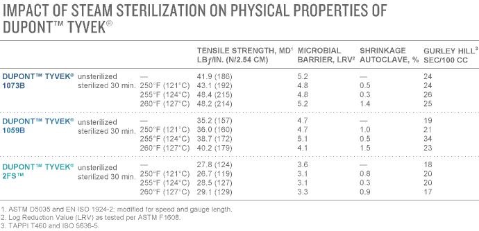 Après une stérilisation à la vapeur dans des conditions contrôlées, DuPont™ Tyvek® conserve son excellente résistance à la traction, sa barrière microbienne supérieure et sa remarquable porosité Gurley Hill ; il ne subit aucune décoloration et rétrécit de moins de 1,6 %.